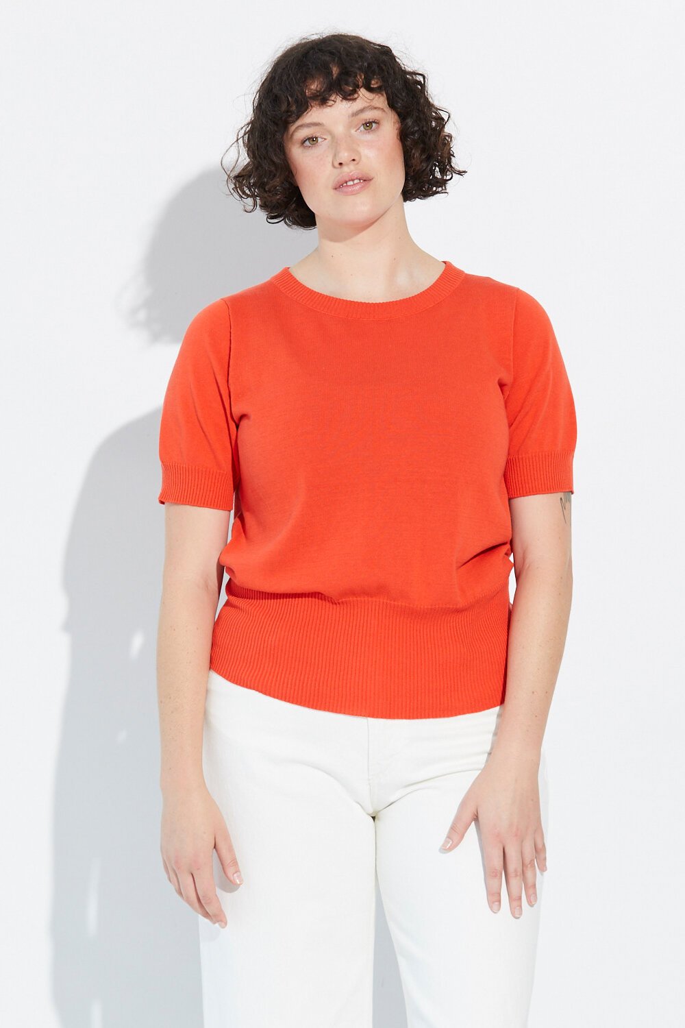 A crew-neck tee knitted in lightweight high-twist cotton, featuring a deep ribbed hem and cuffs, allowing for versatility of silhouette. Wear it as a cropped, slouchy tee or adjust to your preferred length. Dressed up or worn casually, this is an item you will reach for all summer.