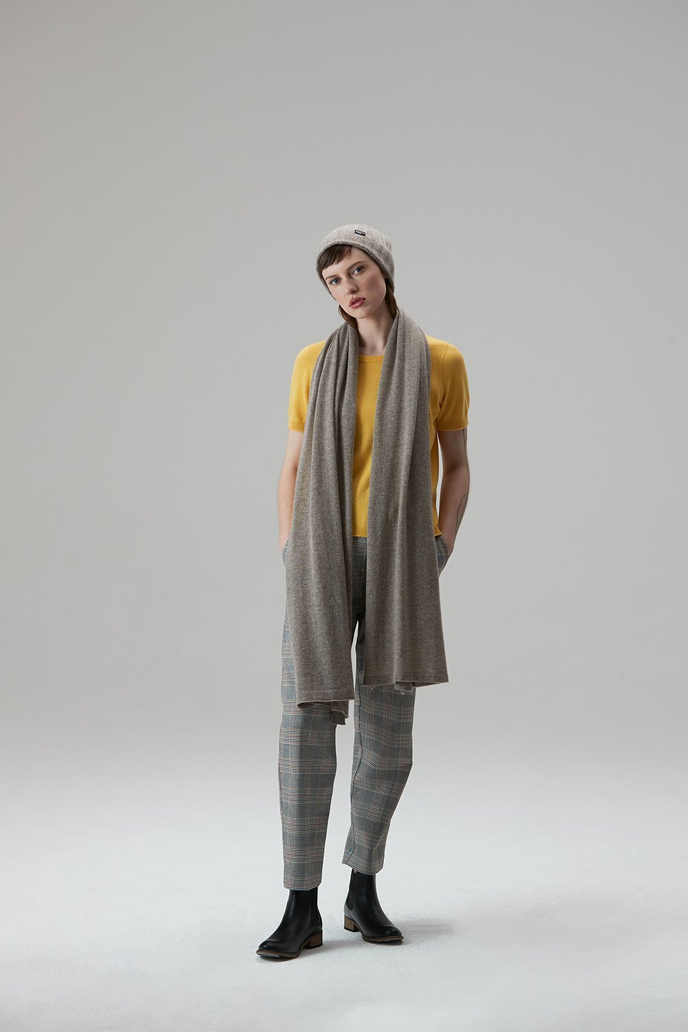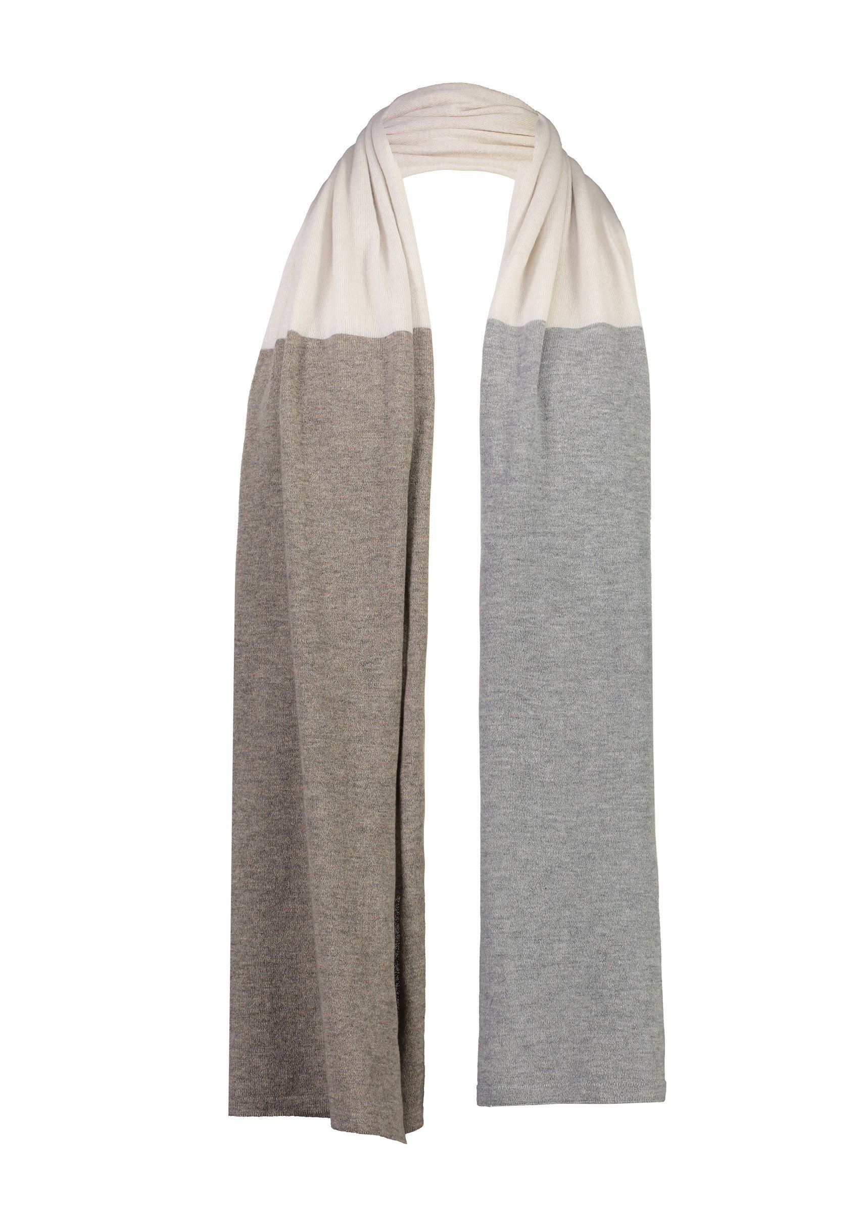 A simple, classic Cashmere scarf featuring a three-tone colour block design. Knitted in a light 15 gauge, this is the the perfect partner for your trans-seasonal wardrobe.