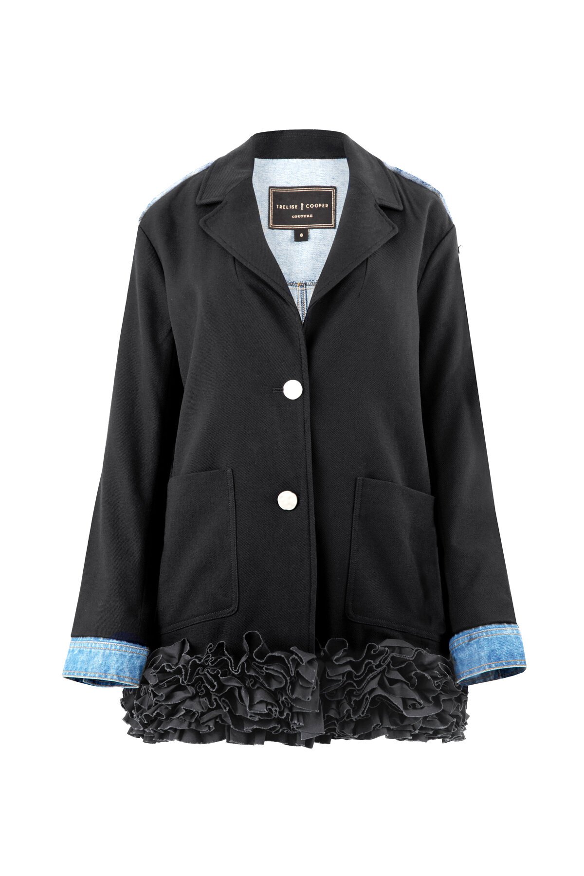 Business in the front, part in the back! Introducing the ‘Back To The Future’ jacket by Trelise Cooper. Contrasting twillfront with denim back for something different and totally awesome to add to your wardrobe. Versatile and chic, we love this relaxed fit jacket over the ‘Don't Stop The Pleat’ dress with biker boots. Features front ruffle hem detailing, contrasting metal buttons at the front and cuffs.