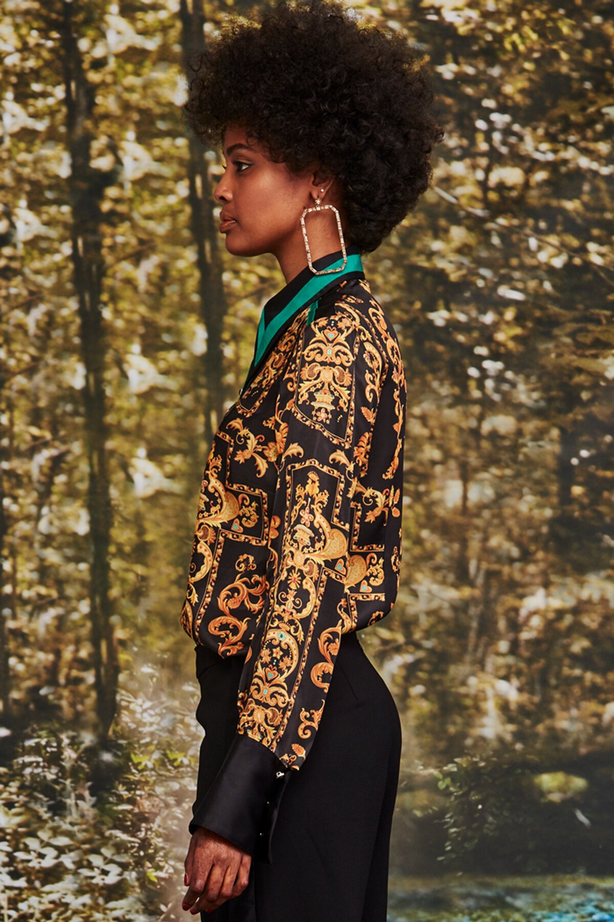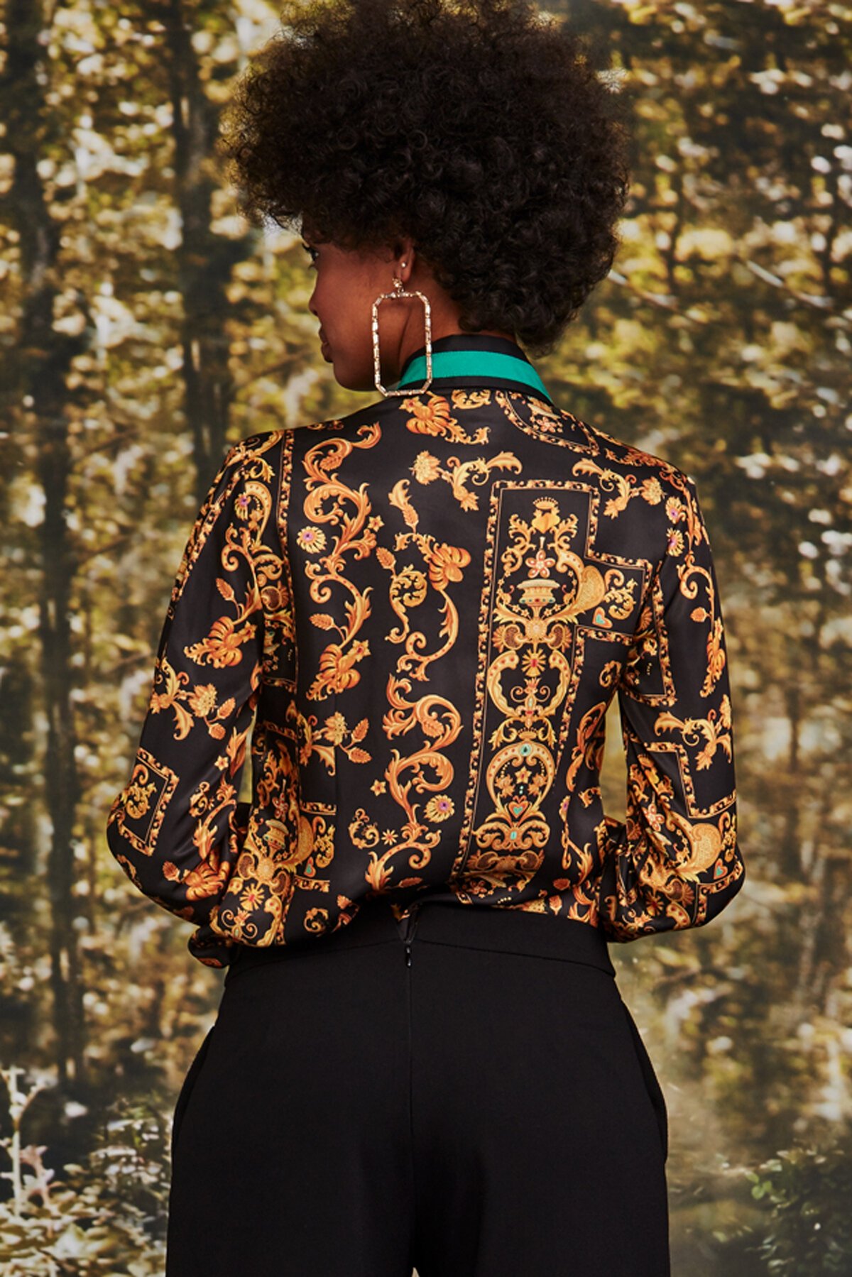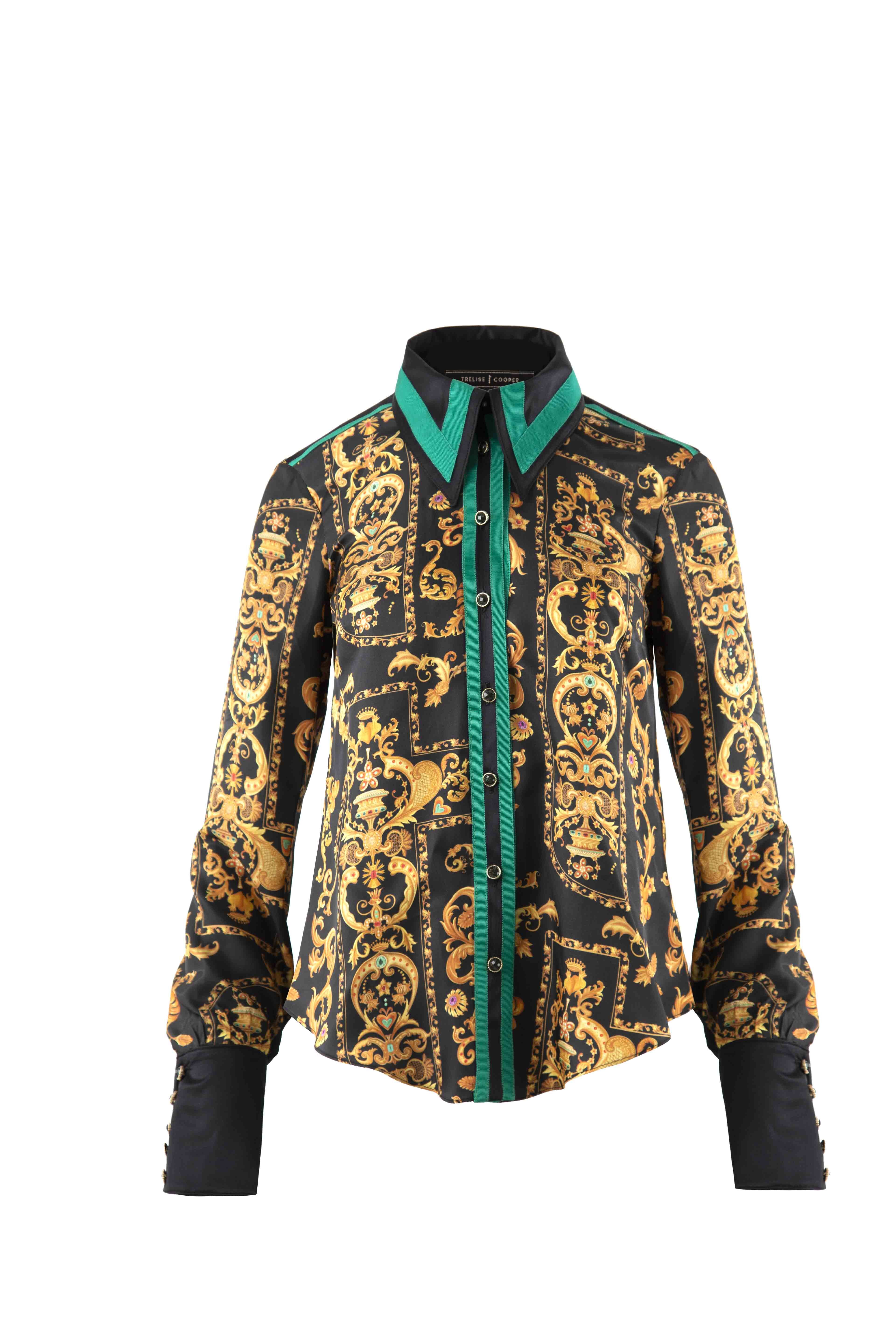 Best seller. The GOLD RUSH SHIRT by Trelise Cooper. Exclusive baroque rayon silky satin fabrication. Features deep black satin cuffed sleeves, contrast jewel green grosgrain accent trimming and button-down front. A timeless statement shirt we love worn with a classic trouser. Button front fastening. Buttoned cuffs