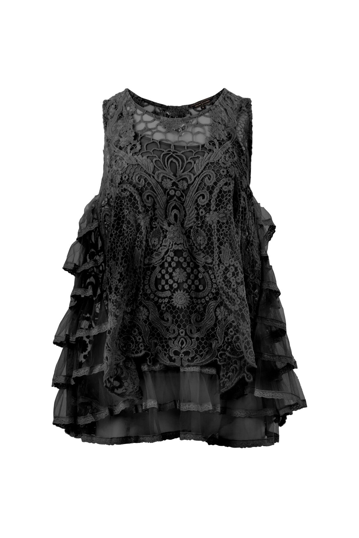 Stunning one-of-a-kind 'Addicted To Love' embroidered lace crafted in an easy-to-wear, A-line silhouette with layered tulle side panel frills. Detailed but easy to dress up or down. We love this top teamed with the "Strut Like Jagger' trousers.