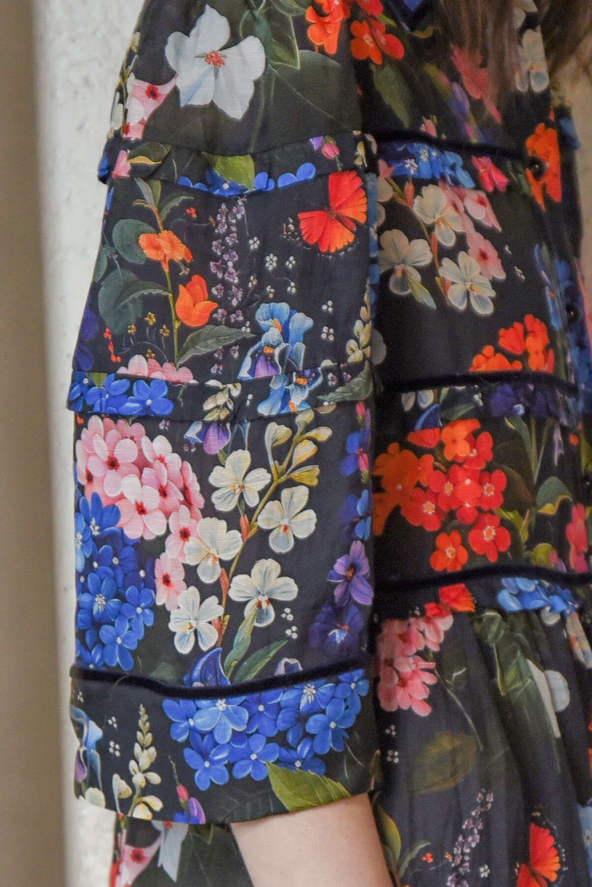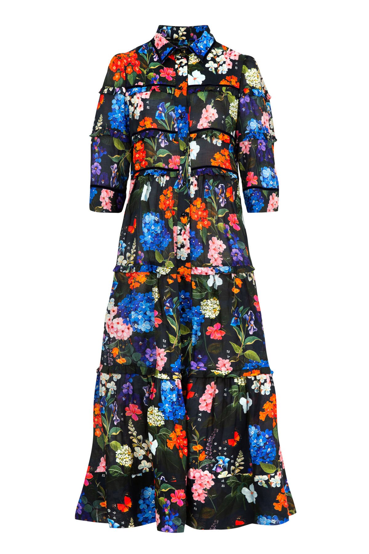 A bold floral print takes center stage in the 'Good Grace' dress, turning every movement into a display of lively, painterly charm. Crafted in our 'Knowledge is Flower' viscose linen, it balances a structured button-through front and classic collar with the softness of gathered, trimmed tiers across the sleeves and body. Cocoon sleeves and velvet trim add refined touches, while side pockets bring practical ease to this effortlessly elegant silhouette.
