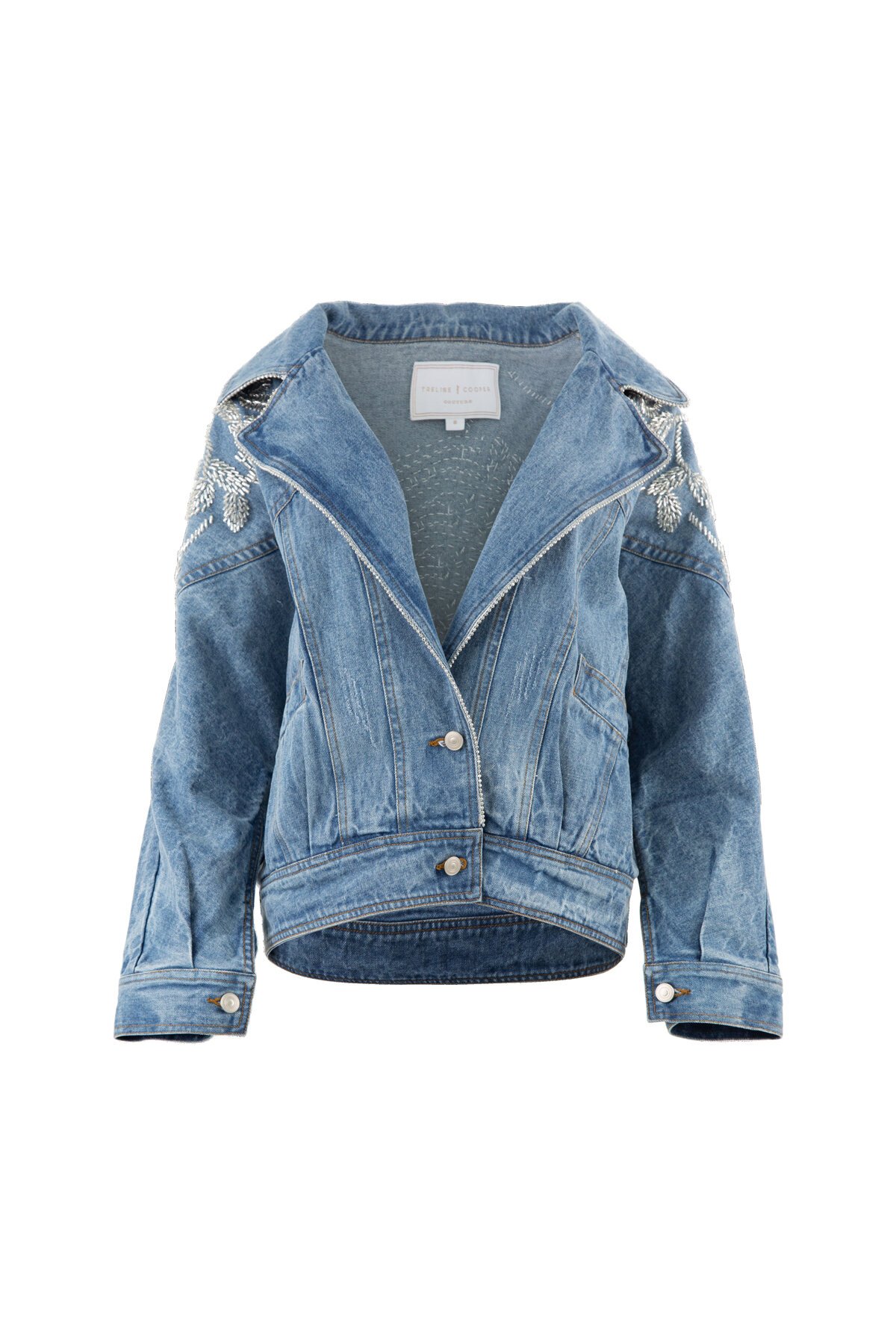 Hand-embellished sparkling silver beads on contrasting blue denim. A one-of-a-kind iconic piece to add to your wardrobe. Features raw edge trim on the outside legs, front pockets, double button front and relaxed, oversized 80's style.