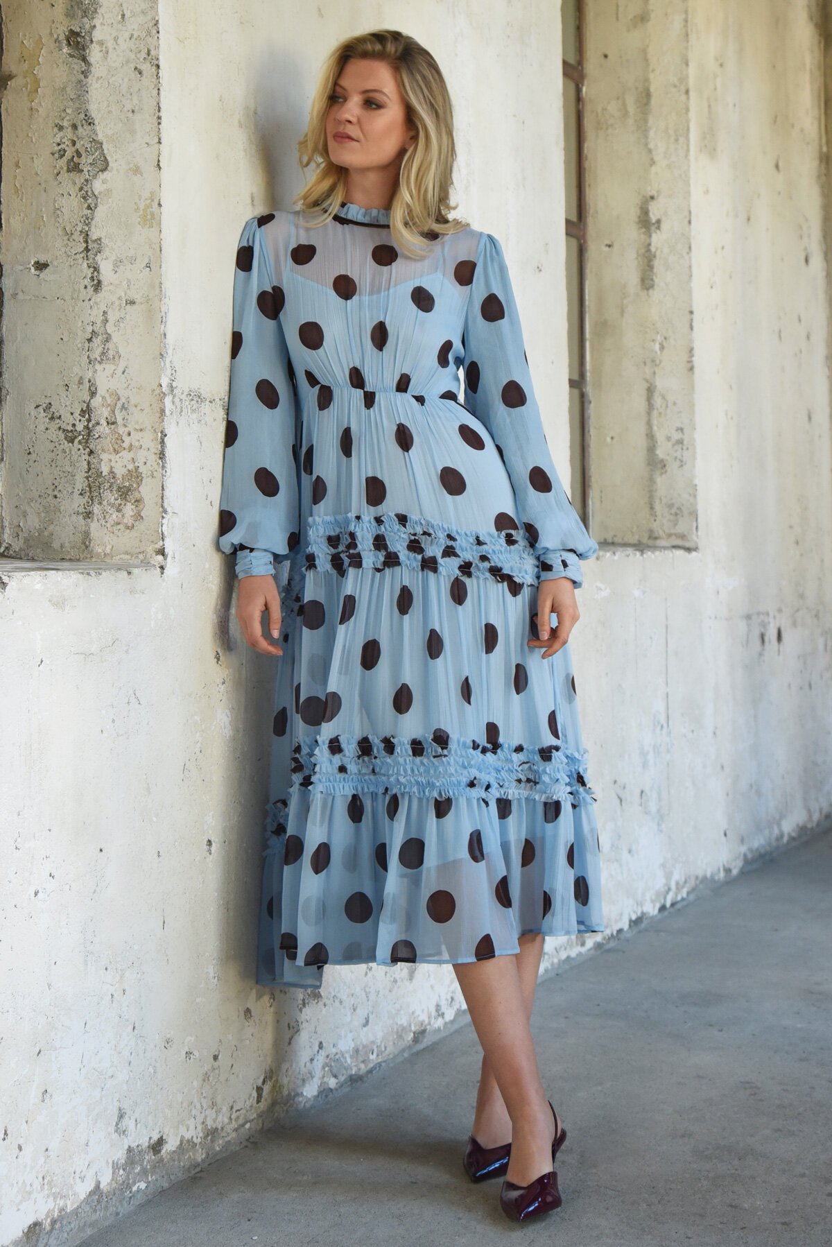 Ethereal viscose yoryu sets the tone for the ‘Madame Rouche’ dress, crafted in the soft, windswept ‘Blue Them Away’ print. A gathered collar trimmed with velvet adds a note of richness, flowing into a gathered waist and a shirred back panel that shapes with gentle ease. Lined balloon sleeves drift gracefully, finished with a rouched cuff and shirred panel for subtle drama. With raw-edge gathered trims and a centre-back zipper, it’s a piece that feels delicate, dimensional, and undeniably dreamy.