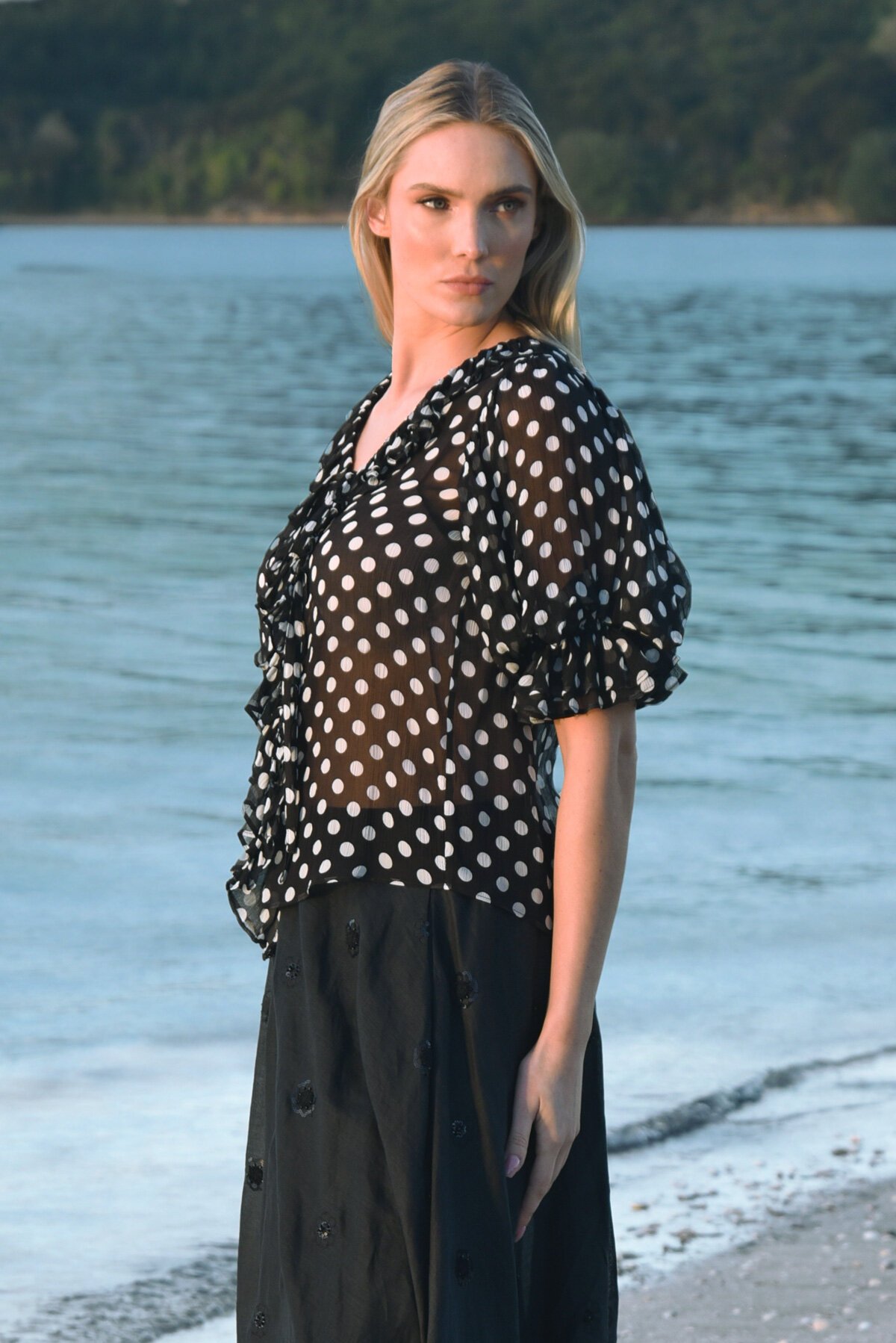 Showcasing a classic spot fabrication with a contemporary silhouette, the ‘Ruffle My Love’ blouse is the versatile wardrobe hero you need. Rendered in the sought after ‘Feeling Dotty’ fabrication, this sweet blouse showcases puff sleeves, complemented with elasticated cuffs crafted to enhance shape. Buttoned through the front and finished with romantic ruffle detailing at the neckline, it boasts unmistakable charm easily dressed up in a pinch.