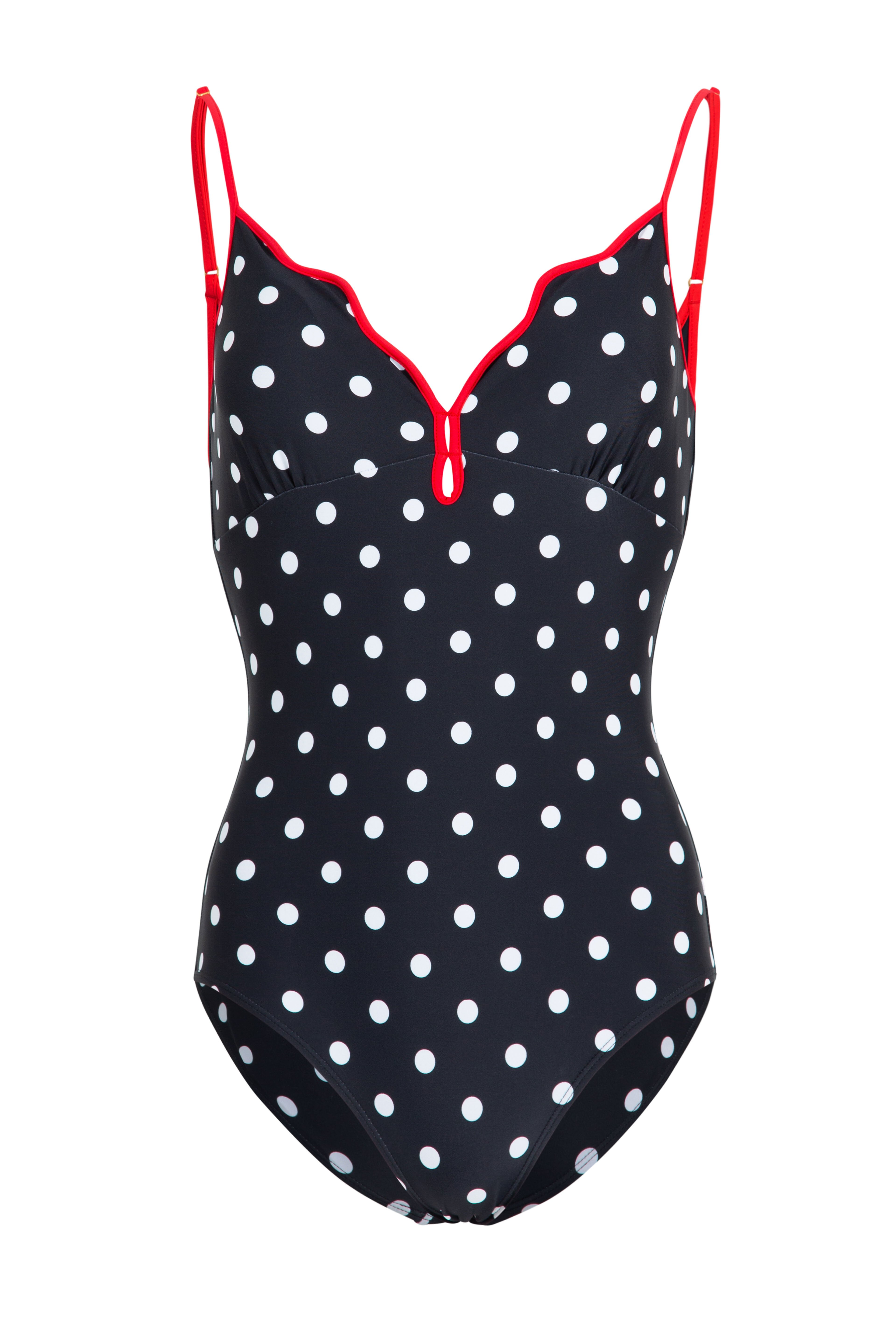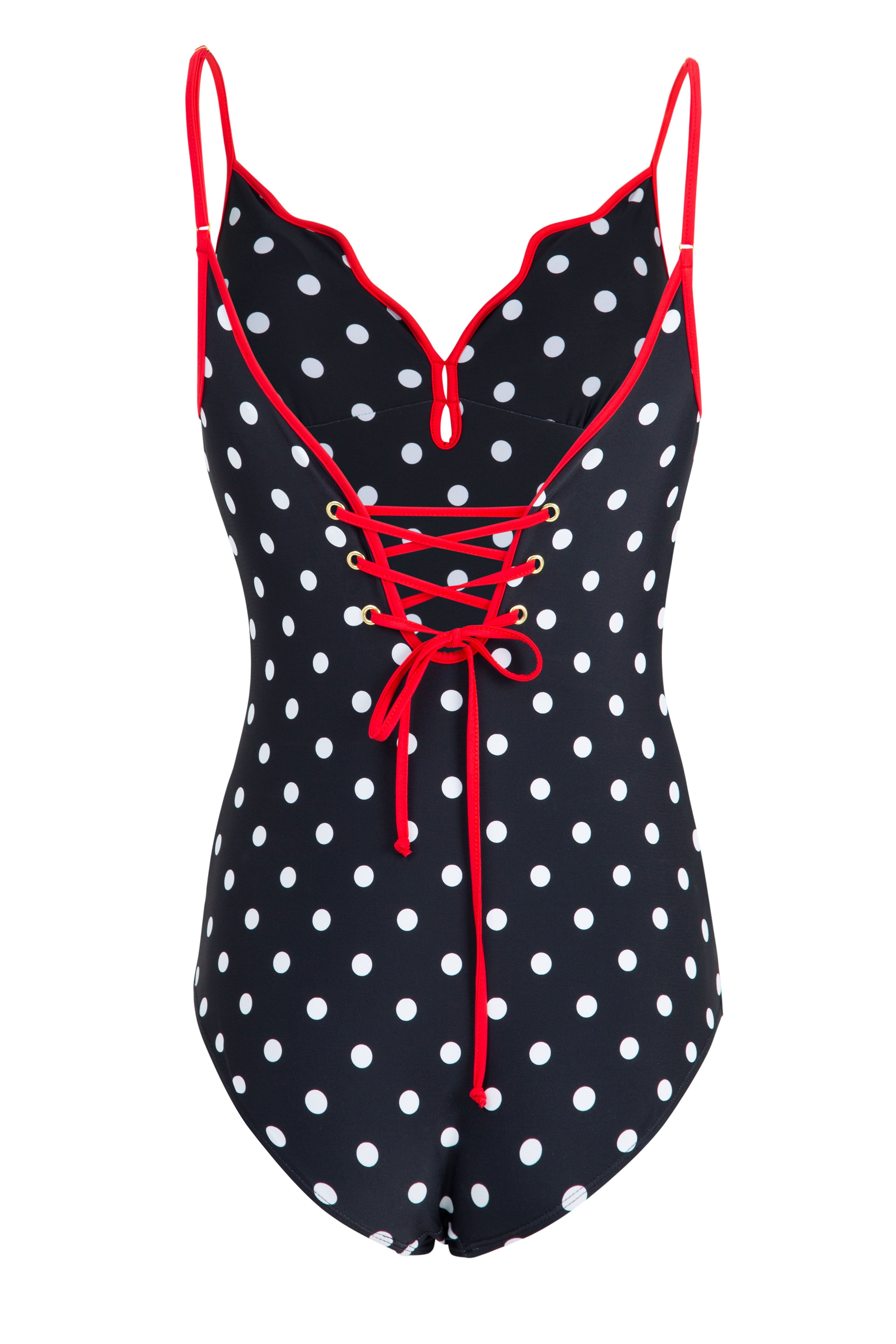 Featuring our timelessly classic ‘Feeling Dotty’ fabrication, the ‘Swim it Back’ swimwear is equal parts refined and fun with its contemporary silhouette and bold print. Showcasing scalloped deep V bustline for a flattering finish, it highlights contrast piping and tie back detailing with an eyelet finish, allowing you to look sophisticated, classic, and feminine for the beach, pool or resort.