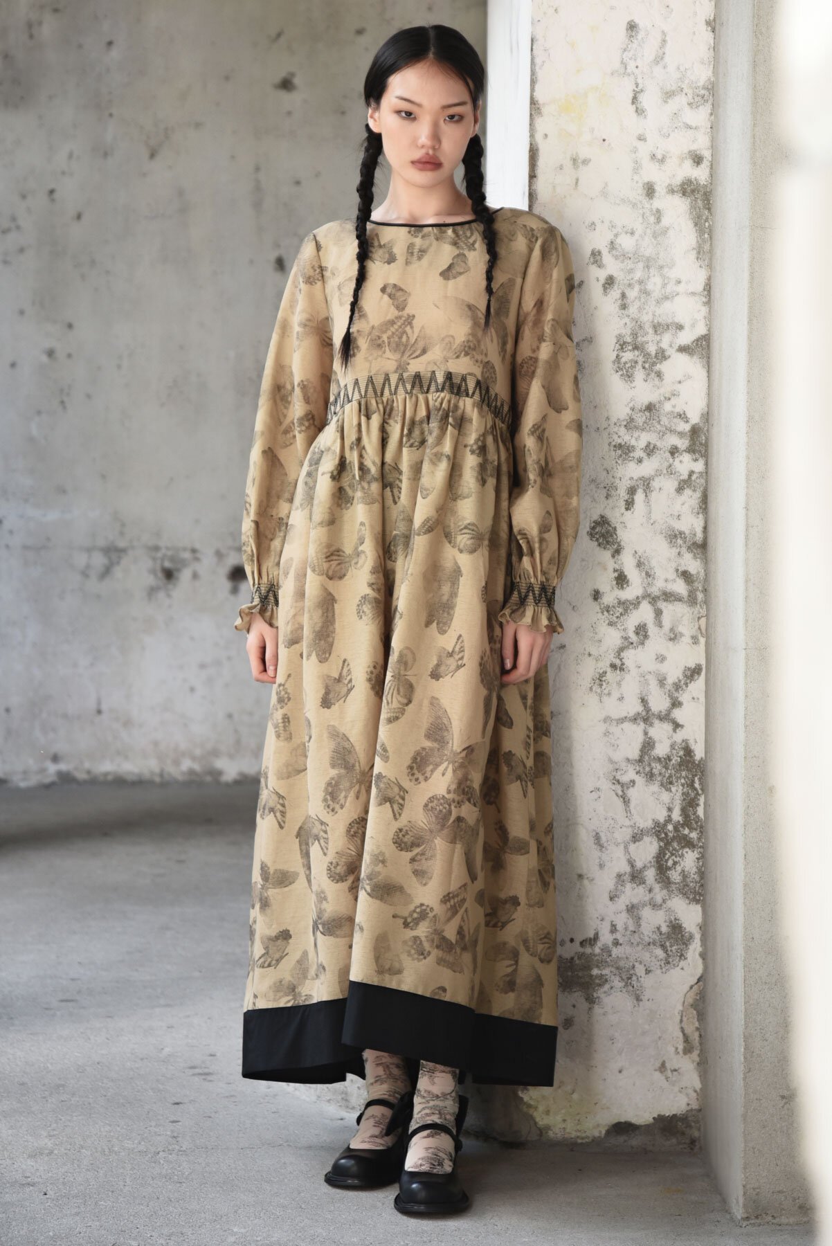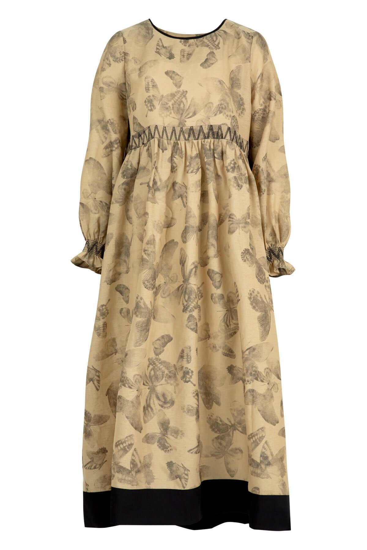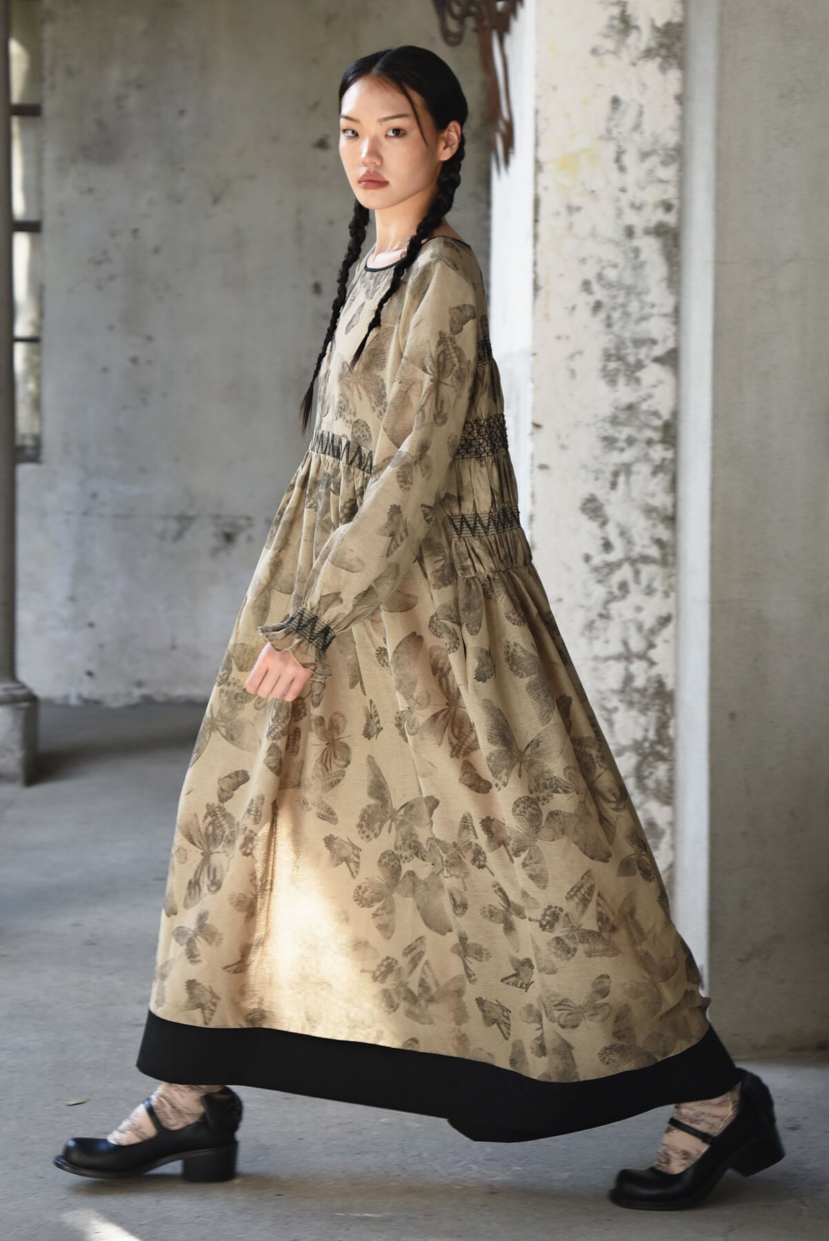 Contrast smocking dances across the waist, cuffs, and back, sculpting the silhouette with delicate texture, while airy 'Float Like a Butterfly' printed gauze drifts softly with every step. The 'We're Shir About it' dress pairs structure and movement beautifully, featuring a high gathered waist, velvet-trimmed neckline, and a contrasting panel at the hem for a whimsical, modern finish.