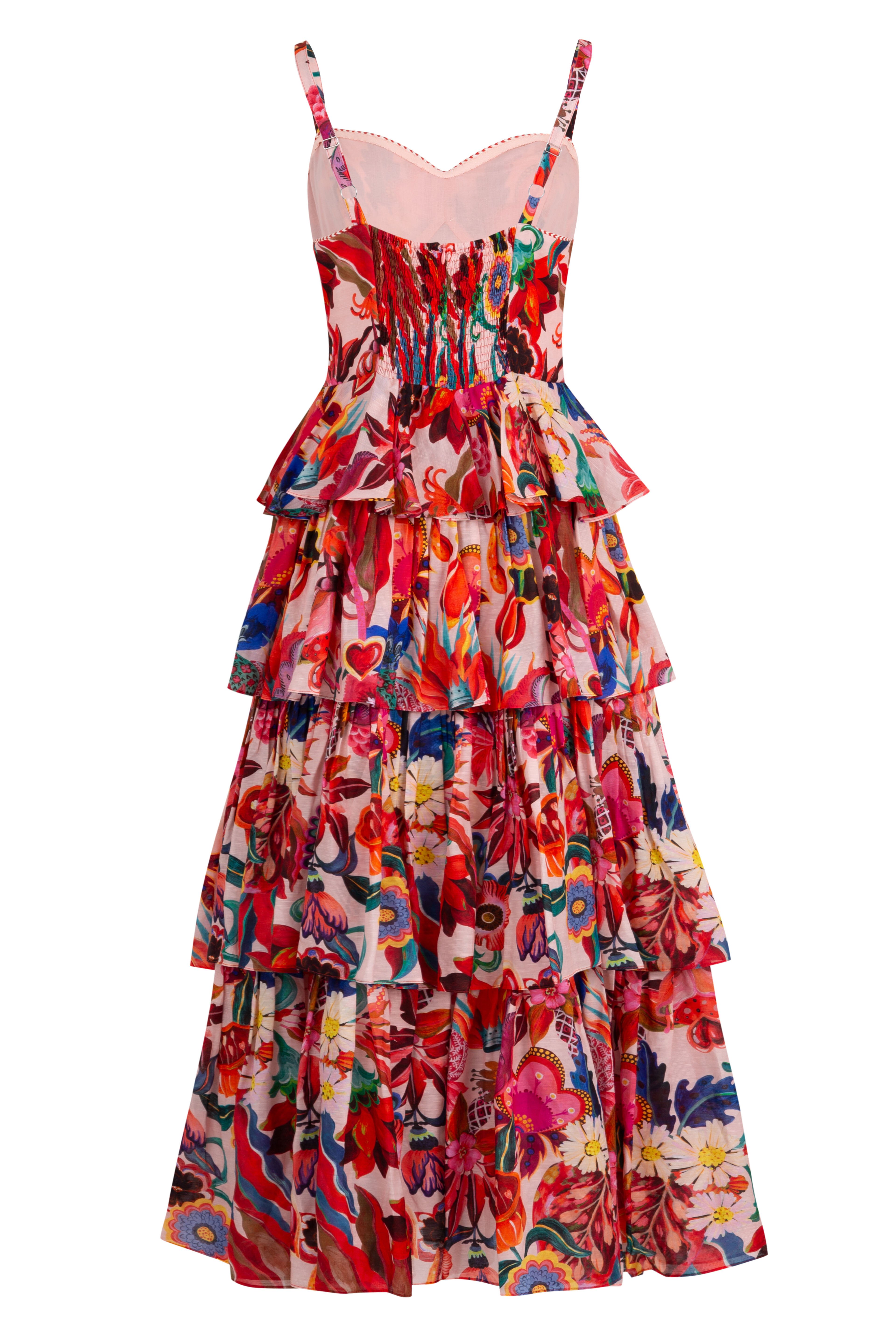 Tiered to perfection and full of volume, immerse yourself in the captivating allure of the ‘You are my Funshine’ dress. Visually striking in the ‘Carnival Calling’ florals, this head turning dress features adjustable straps, with a fitted bodice and sweetheart neckline built to enhance the curves. Falling from the waistline in fine pintuck pleated tiers, it offers waves of movement and bring a sense of drama and intrigue to any event.
