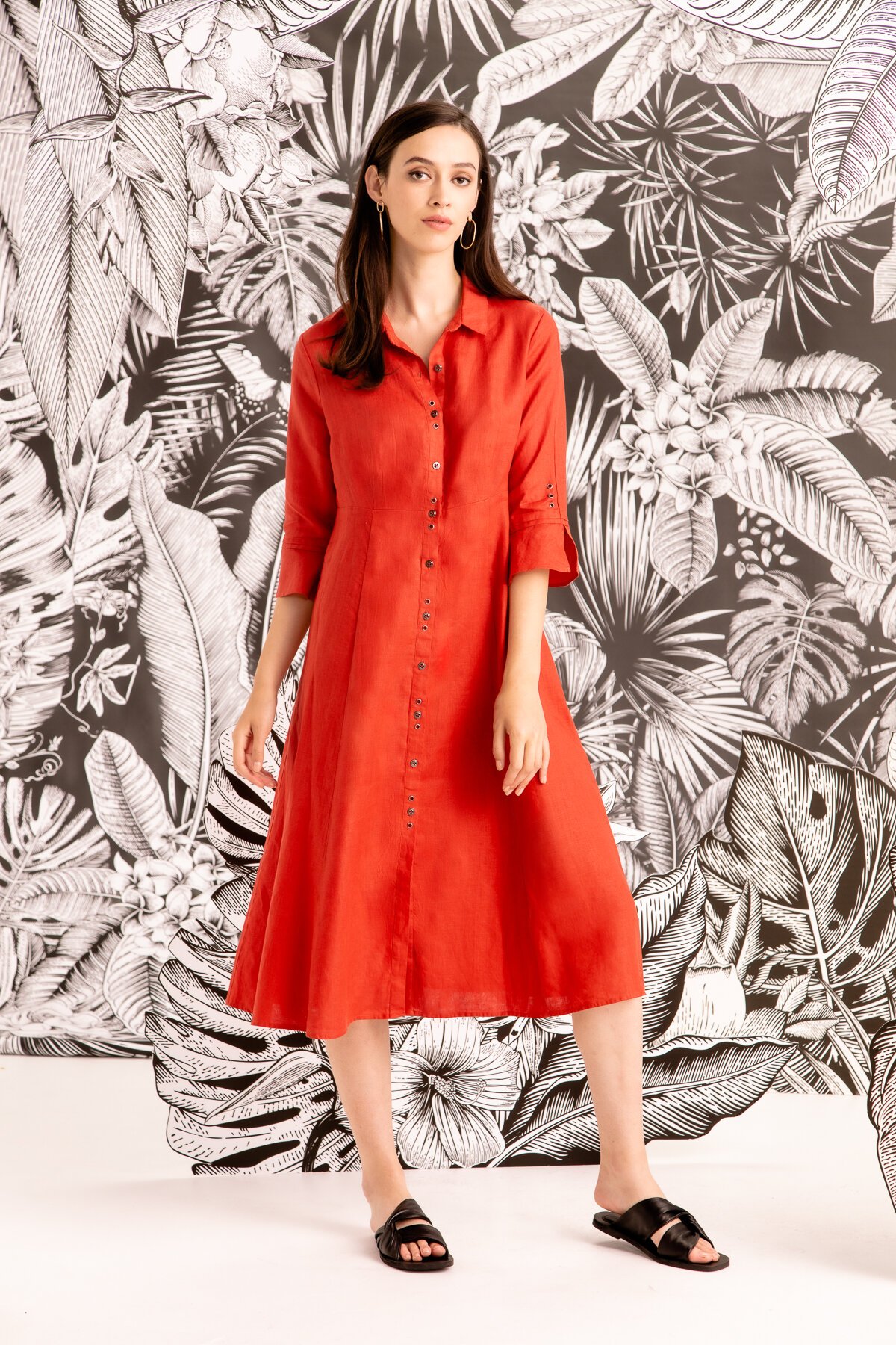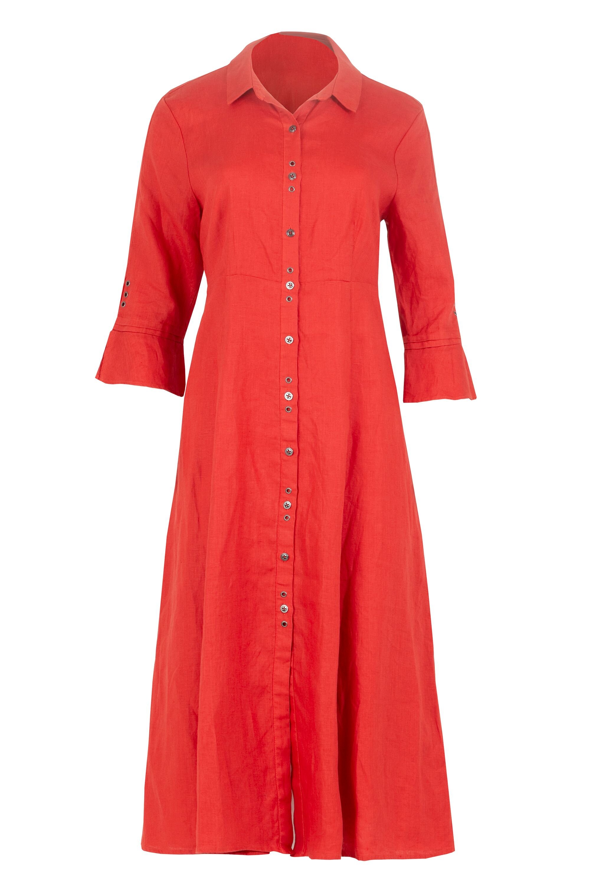 100% Linen  button through ShirtDress with collar.  3/4 length sleeves with fluted cuff and hardware detail.  Eyelet detail down front placard.