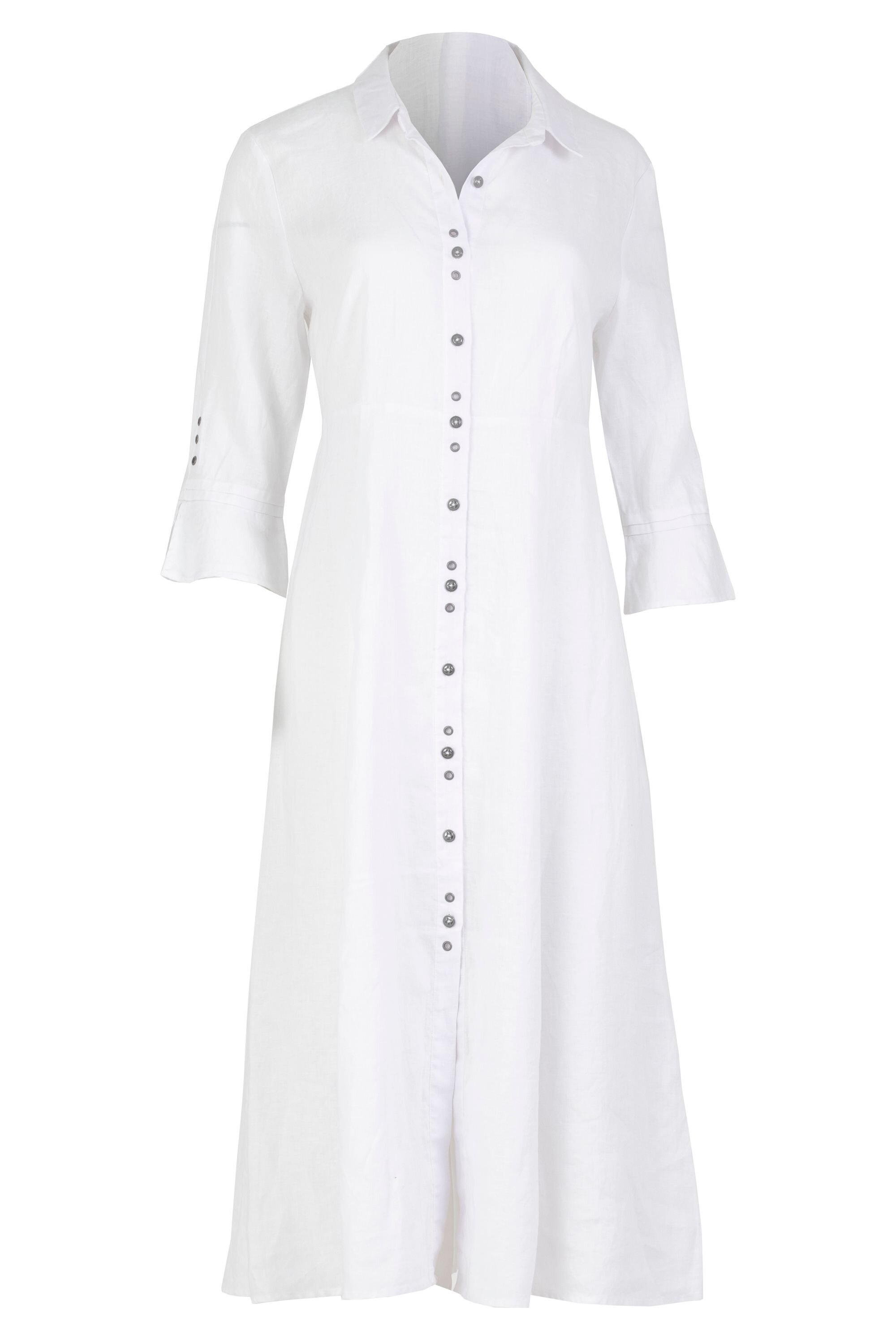 100% Linen  button through ShirtDress with collar.  3/4 length sleeves with fluted cuff and hardware detail.  Eyelet detail down front placard.