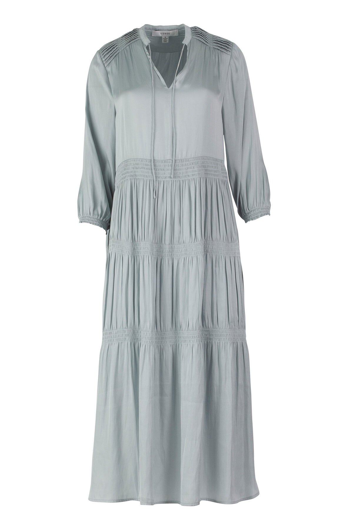 Stunning liquid Satin Dress with pleat detail on back yoke and front shoulders and mandarin collar with front ties.  3/4 length sleeves feature a shirred cuff. Features soft shirred panels through the Skirt and falls to mid calf.