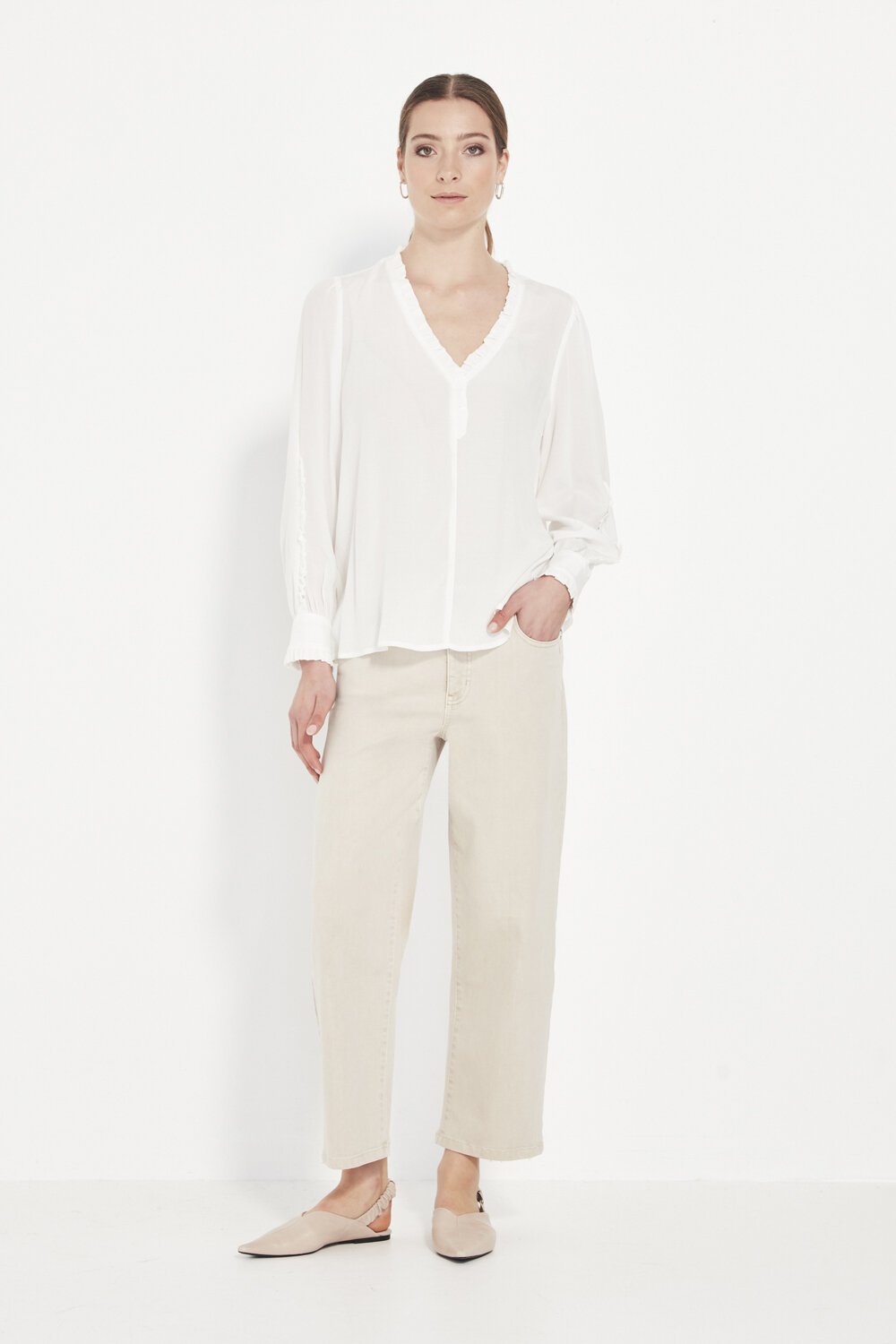 The Cascade Blouse is crafted from a soft drape Viscose/Rayon blend, giving the silhouette beautiful movement and a smooth, feminine fall. Designed with delicate frill detailing along the V-neckline, sleeves, and cuffs, it brings gentle romantic texture without feeling overly fussy.