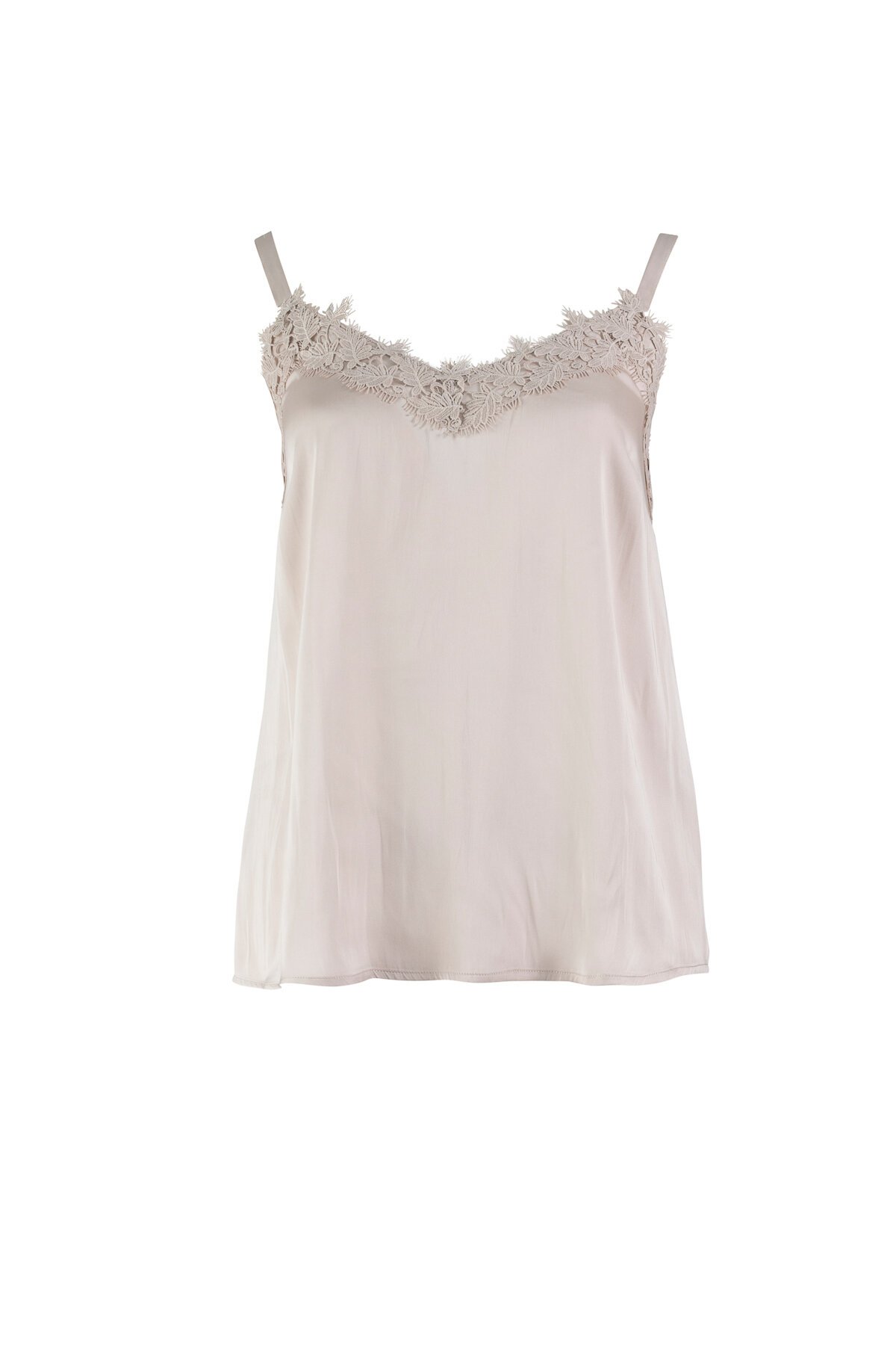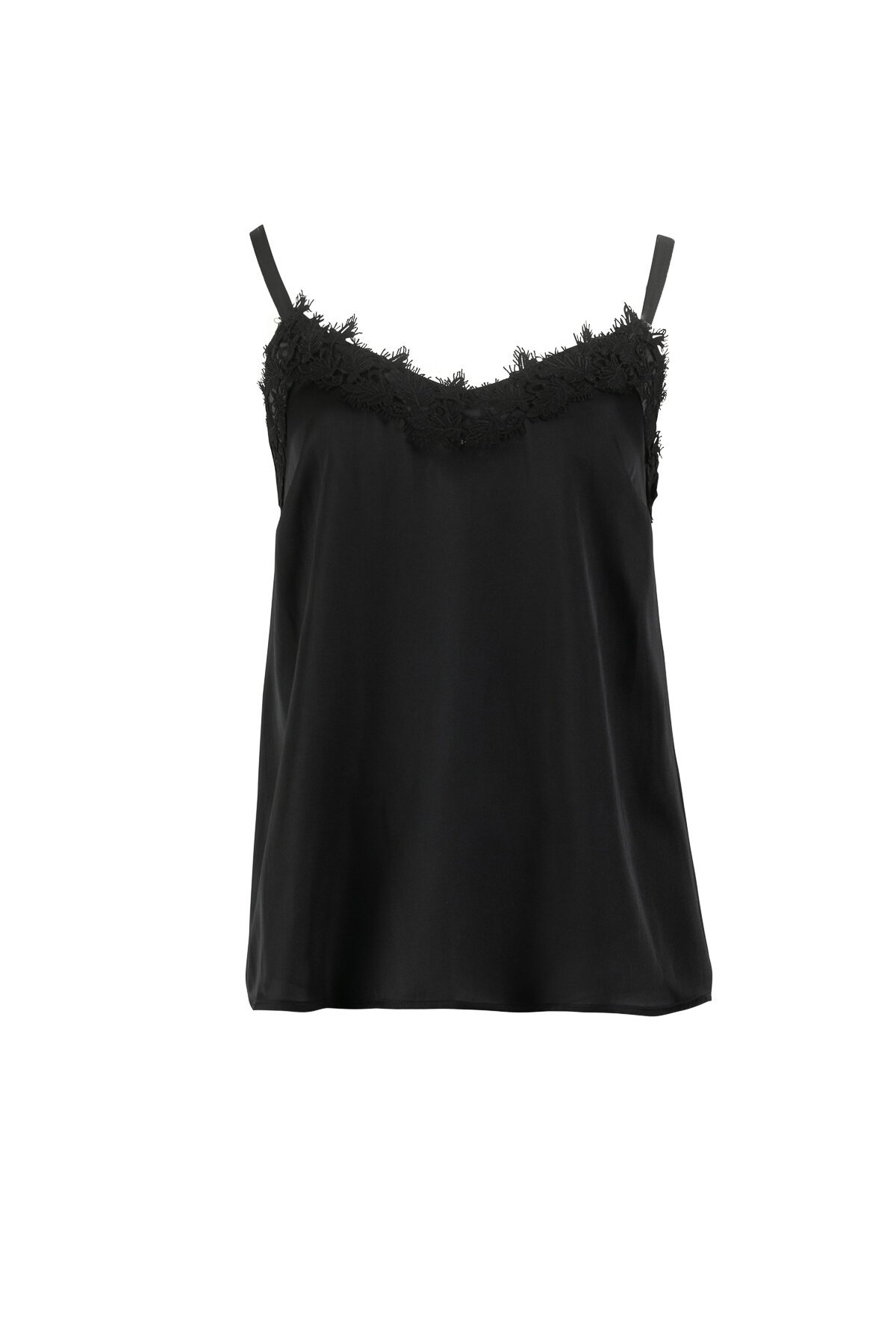Liquid Satin Cami with bra friendly straps and stunning lace detail and V neckline.  Falls to the hip.