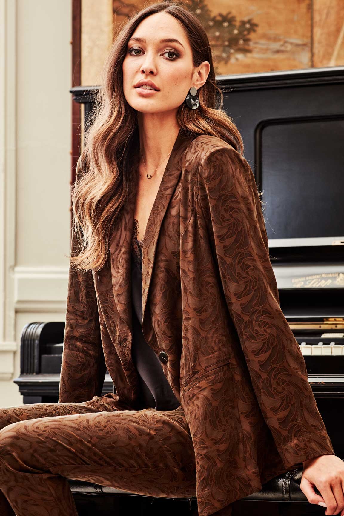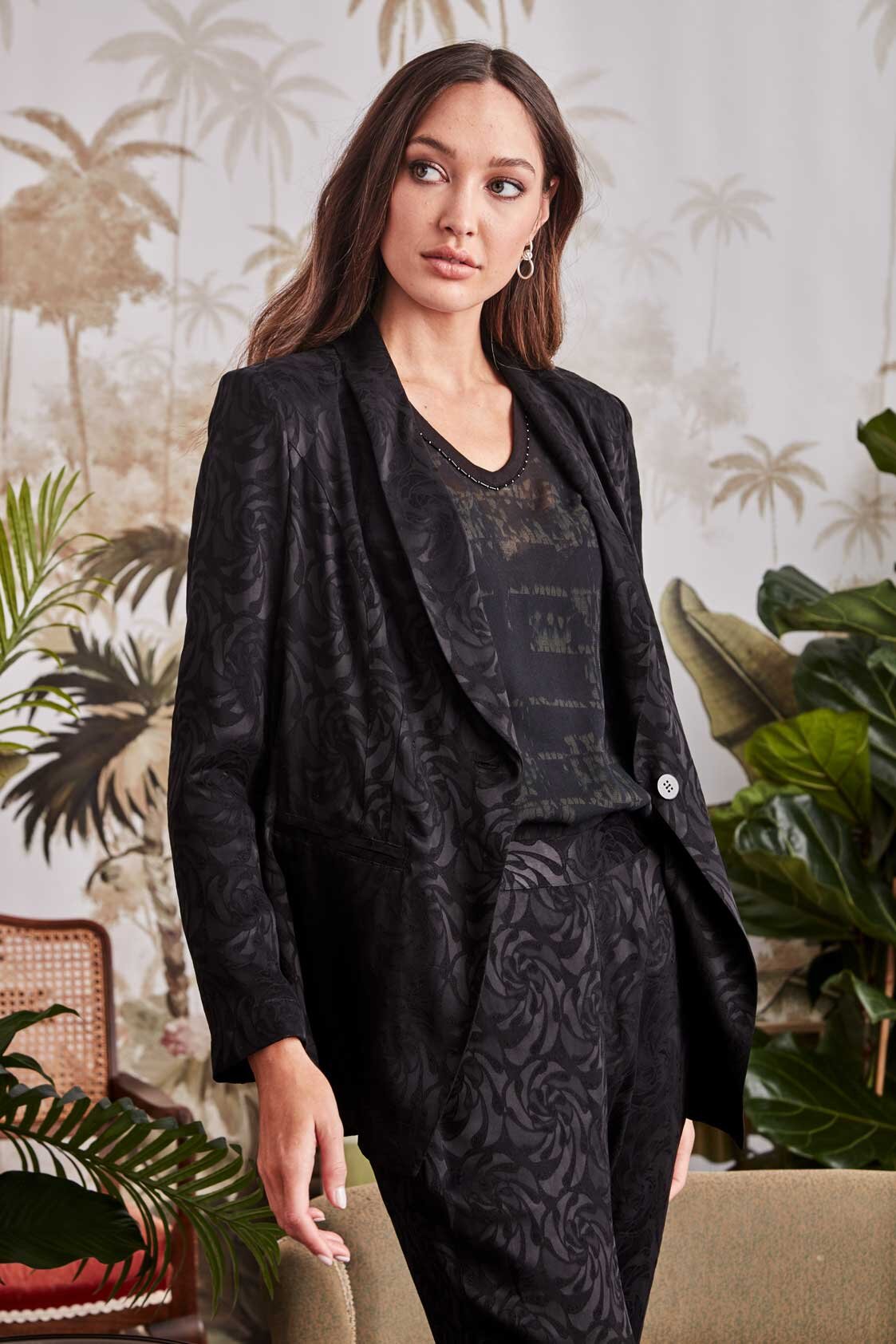 Relaxed fit tailored blazer with single button. Front jet pockets and back vent. Sophisticated swirl jacquard fabric with a dressy edge. Can also be worn as a set with the Collective Pant for that cool edge.
