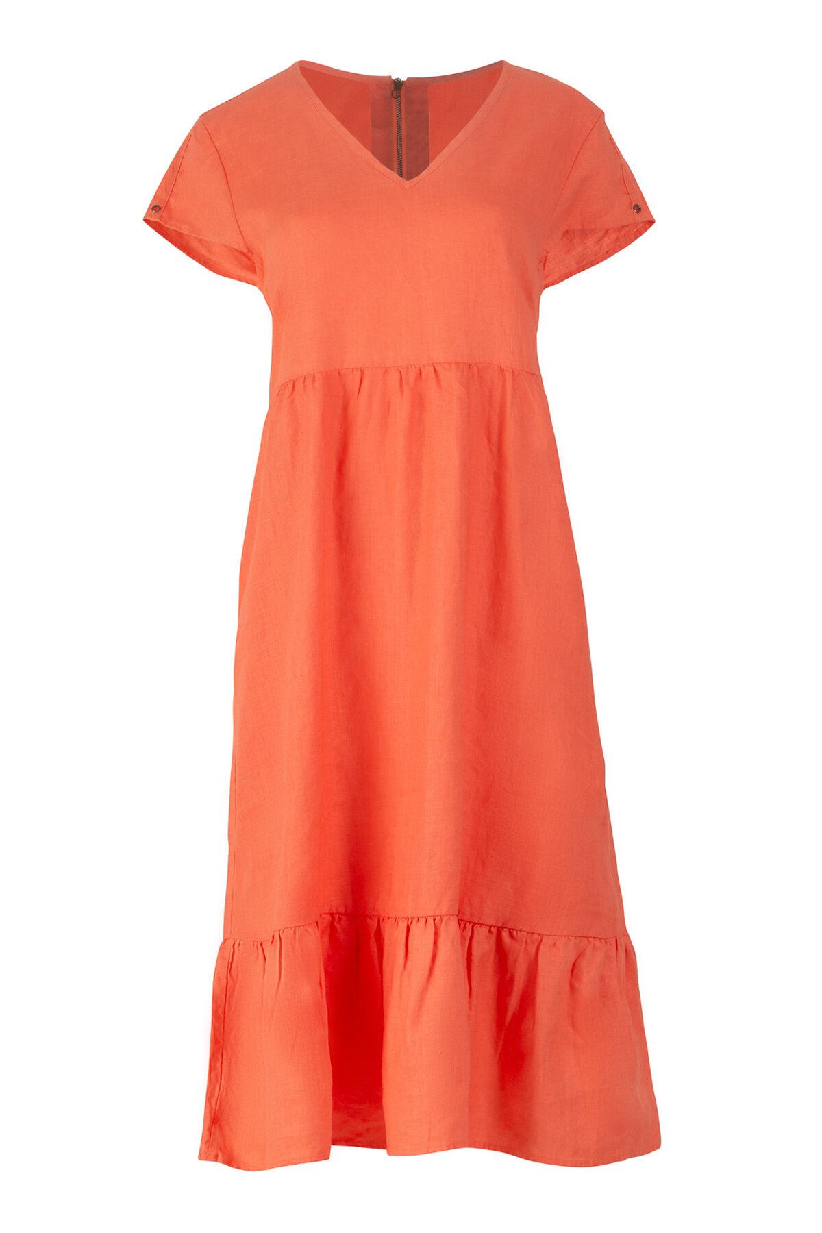 100% Linen Dress with V neckline and capped sleeve.  Dress features tape and hardware trim and side pockets.  Falls below the knee.