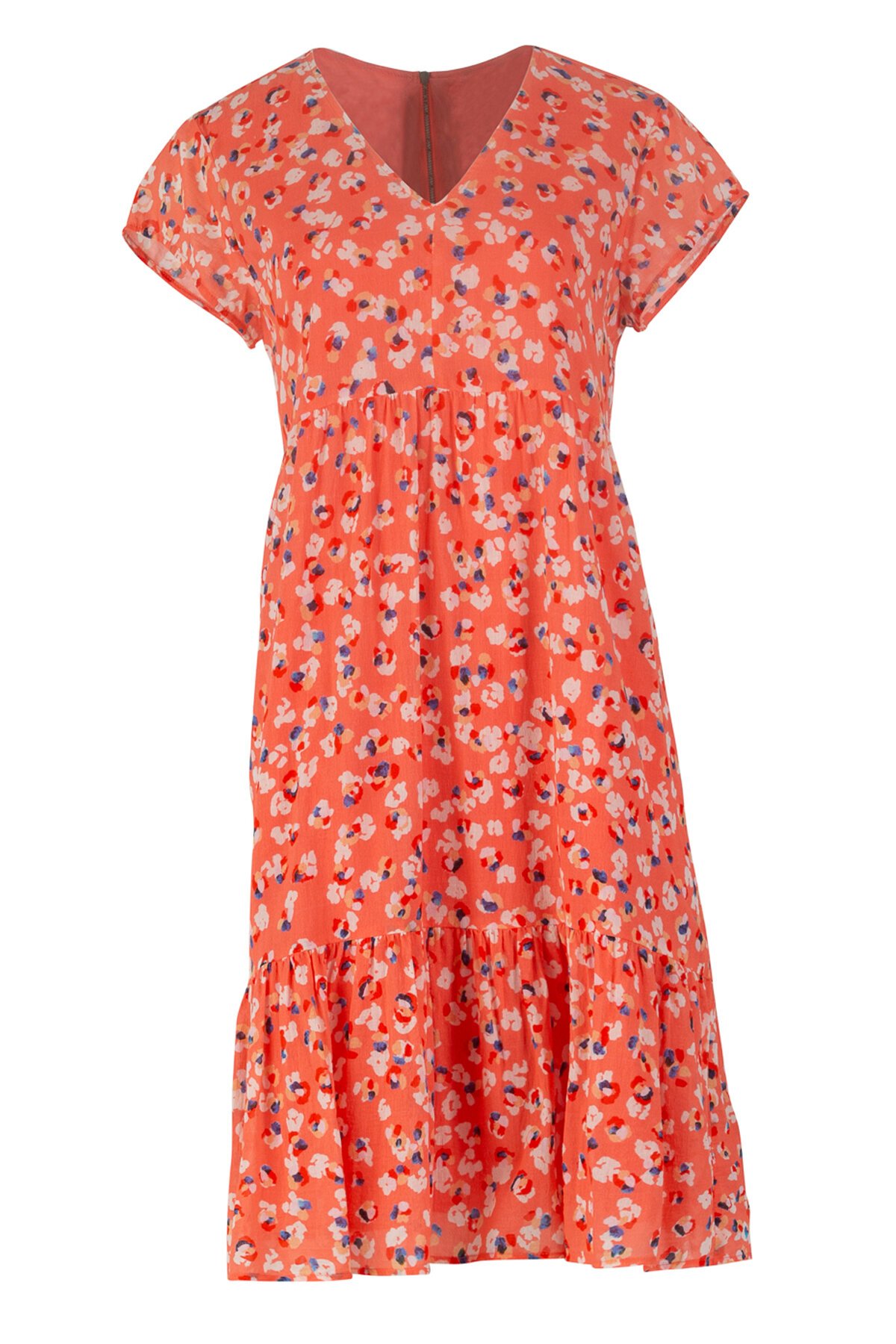 Petal print Dress with V neckline and cap sleeve.  Relaxed fit Dress with tiered Skirt.  Dress falls below the knee.