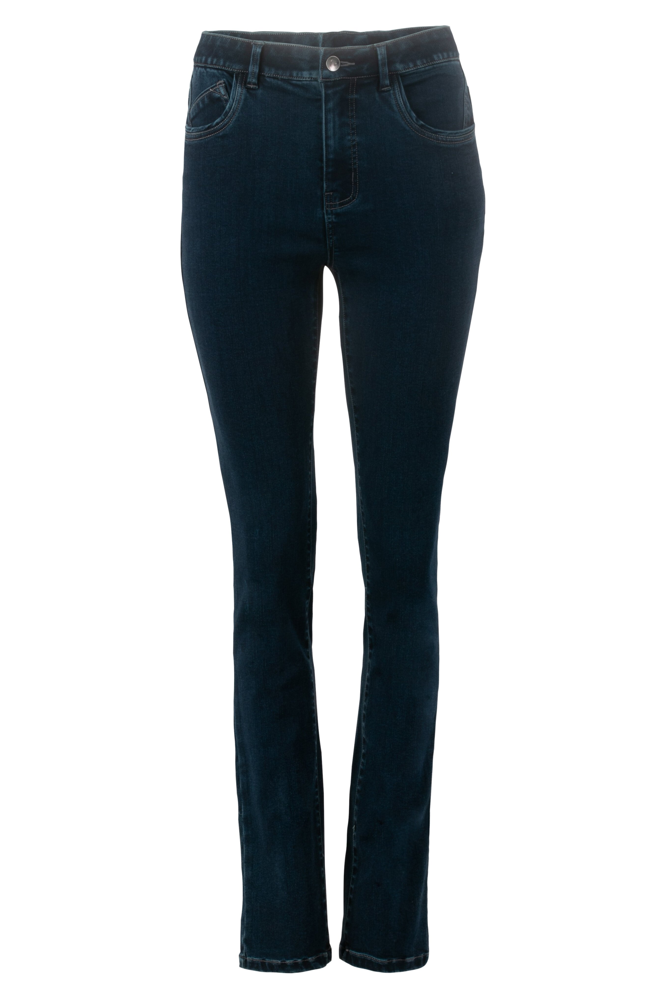 Ultra-flattering full length jean. 5 pocket slim leg with excellent body shaping and recovery in the fabric. Satin Blue wash so it can be worn both casual and dressy. Supportive front panels and flexible waist. Higher rise that sits above waistline.