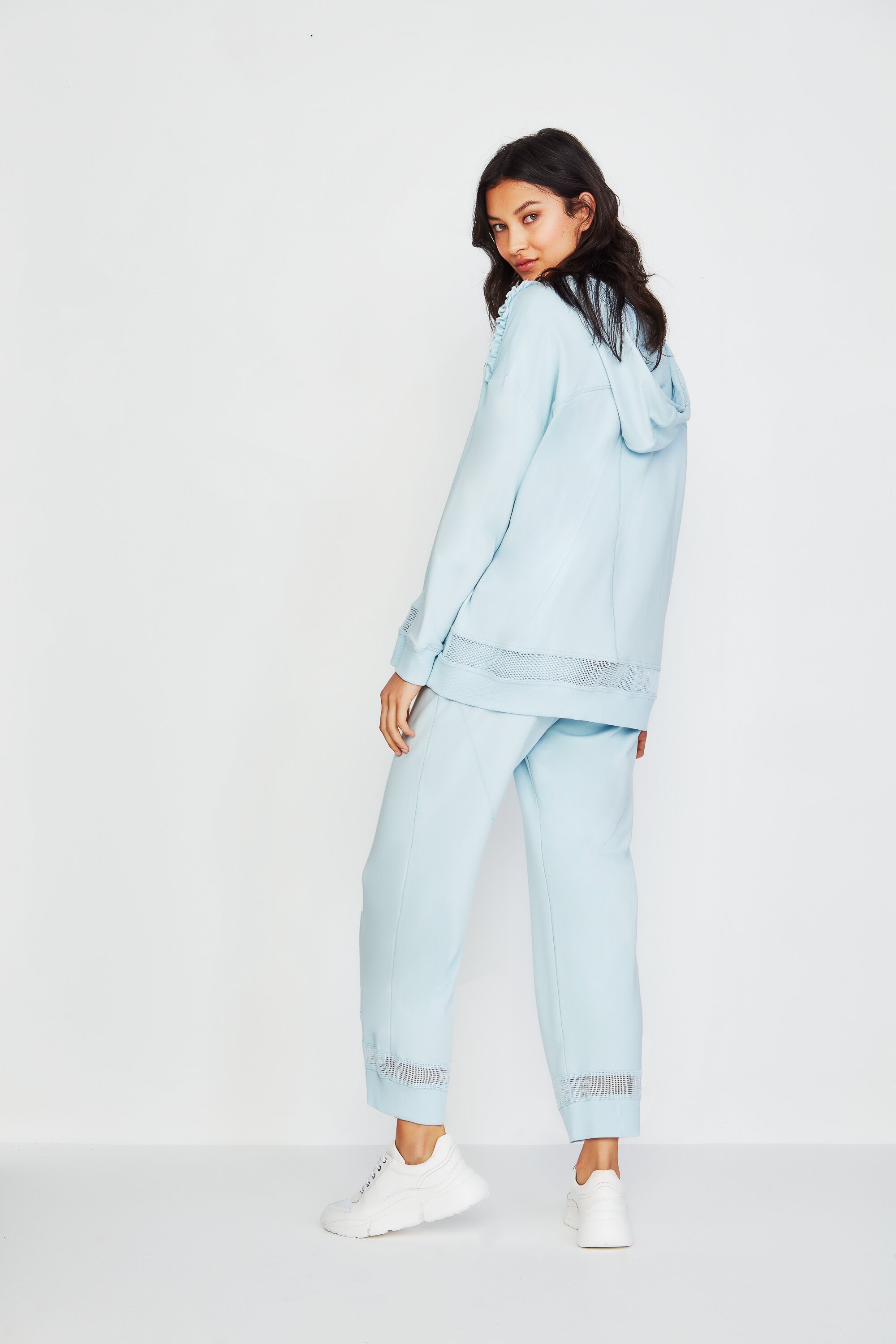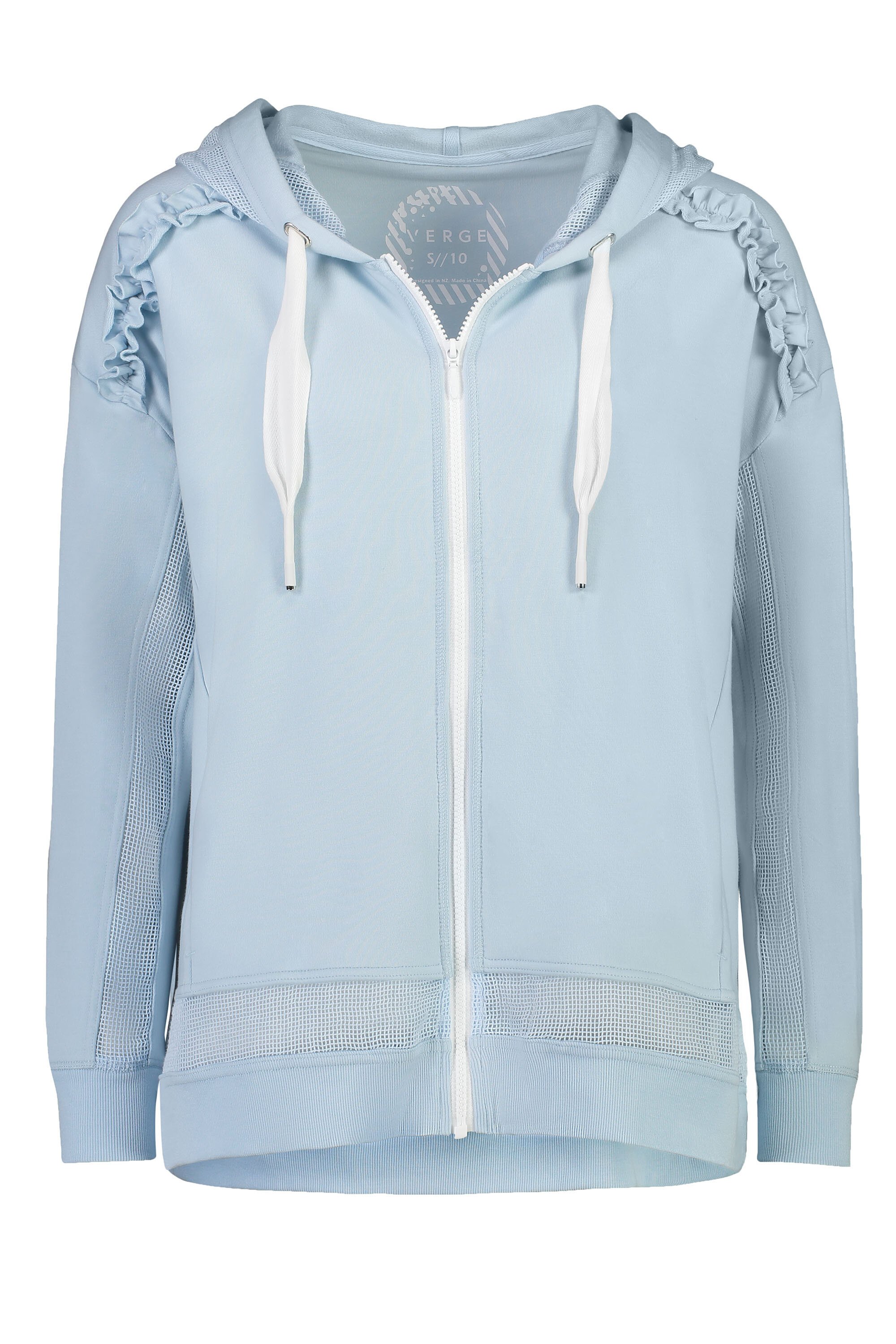 Cotton/Modal hooded sweat jacket with zip front and side pockets.  The Sorbet jacket features ruffle detail on shoulder and mesh insert panels at along the sleeve and at hemline.  The Sorbet jacket falls longer at the back.
