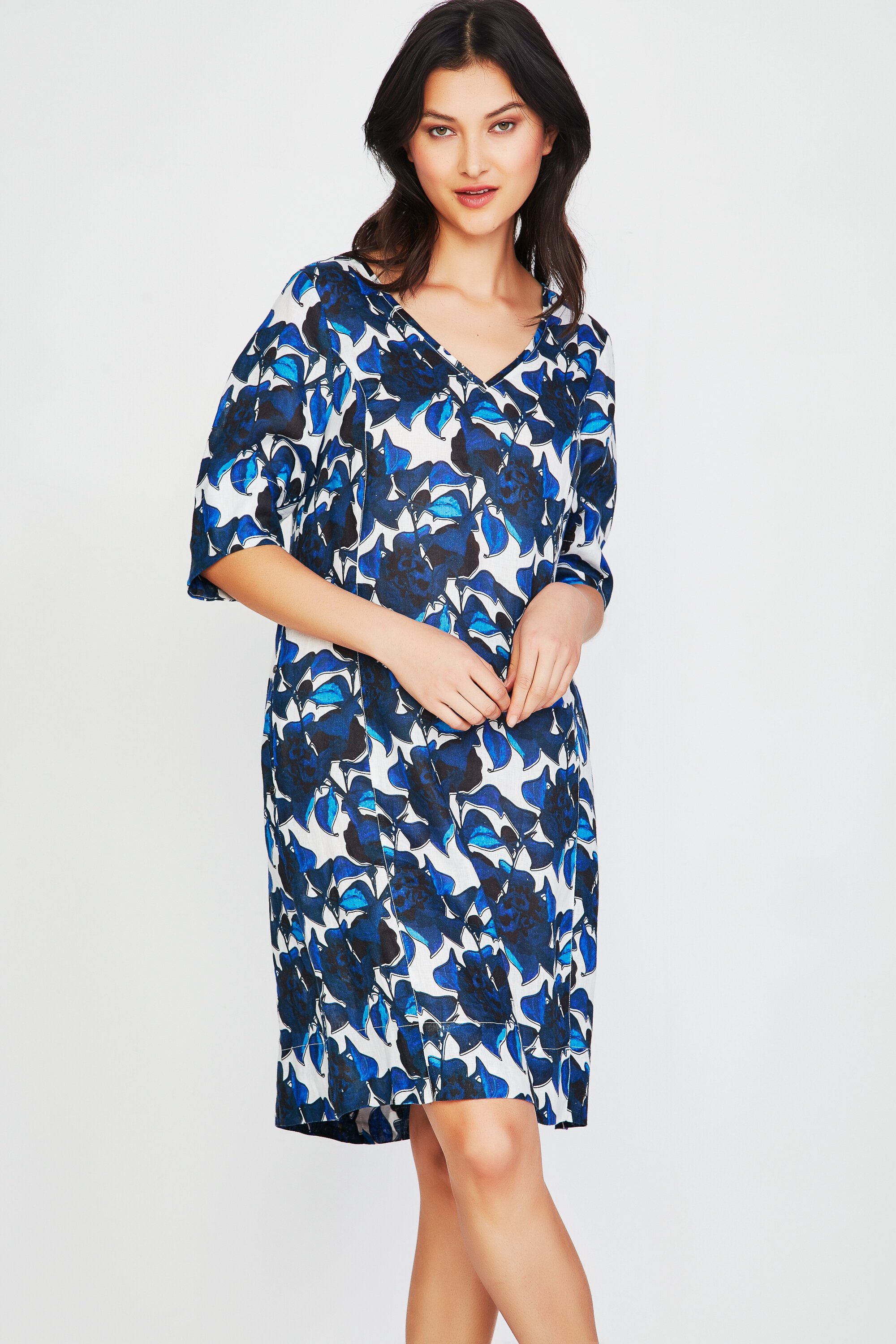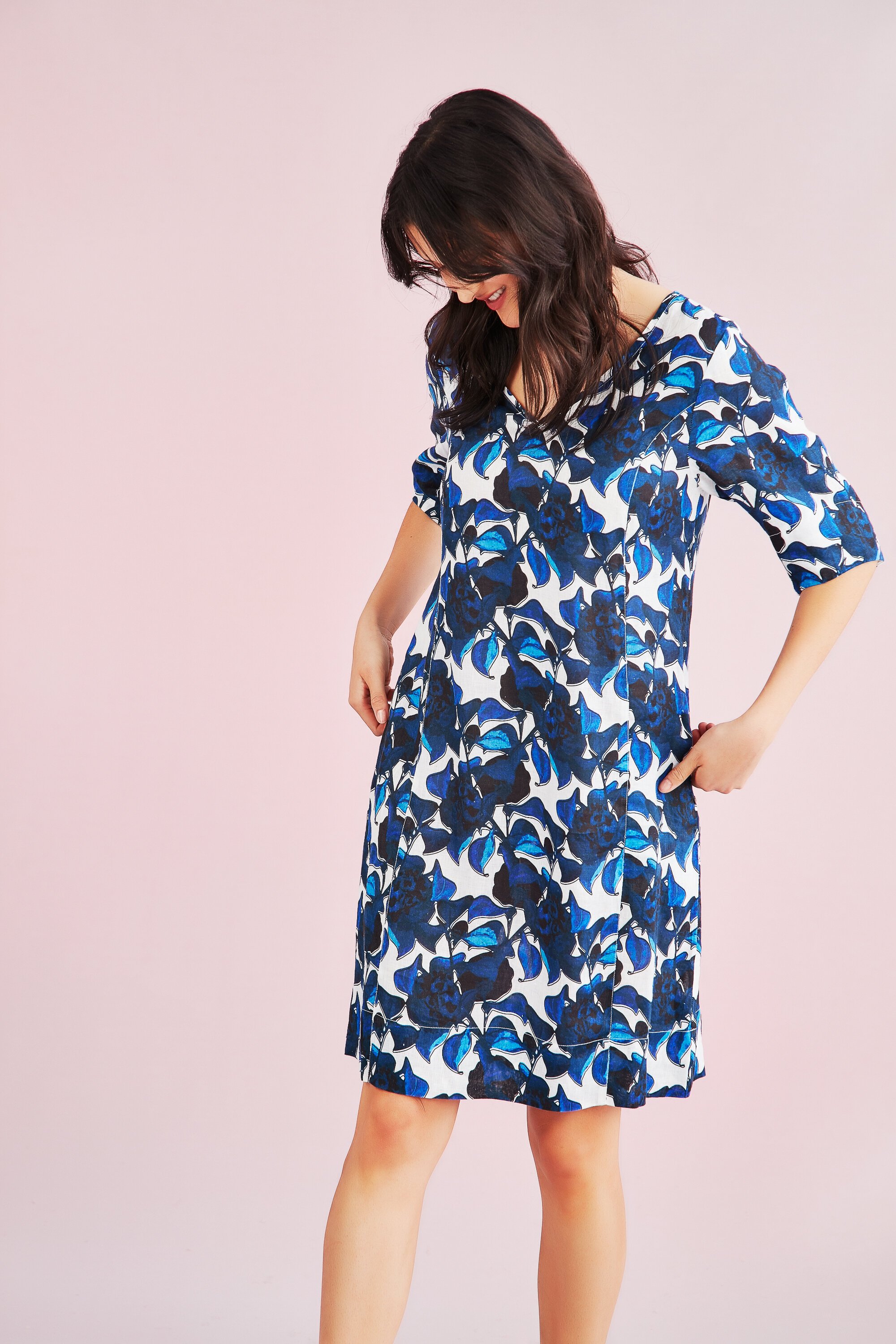 100% Linen printed shift dress with V neckline. The Wellesley dress is panelled for relaxed shape and features Tulip shaped sleeves that sit just above the elbow.  The Wellesly dress has a back zip and falls below the knee.