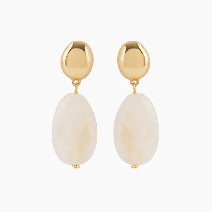 The Lilah Earrings by Zahar feature a smooth gold stud paired with an elongated beige resin drop with soft marbling. The natural tones and fluid silhouette create an understated elegance, making them an effortless statement for both everyday wear and special occasions.