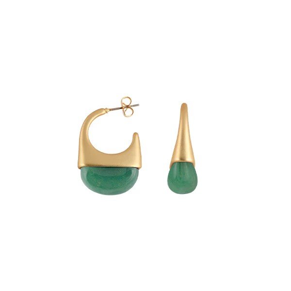 The Poppy Earrings by Zahar feature a gold arc that cradles a smooth aqua-toned resin drop. Artful and unexpected, this design is modern and playful - perfect for adding a creative edge to any outfit.